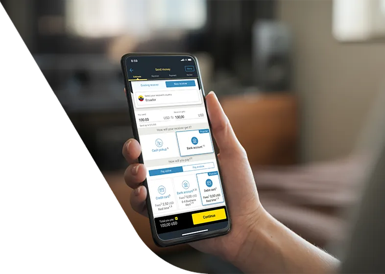 When deciding how to send money to Ecuador, you can choose between sending money online, via our app, or in person. Pay with a bank account, cash or credit2/debit card.